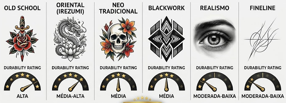 É importante sermos realistas: nem todos os estilos envelhecem da mesma forma. Se a sua prioridade absoluta é uma tatuagem que pareça "intocada" por décadas, o Old School e o Oriental são os vencedores imbatíveis.